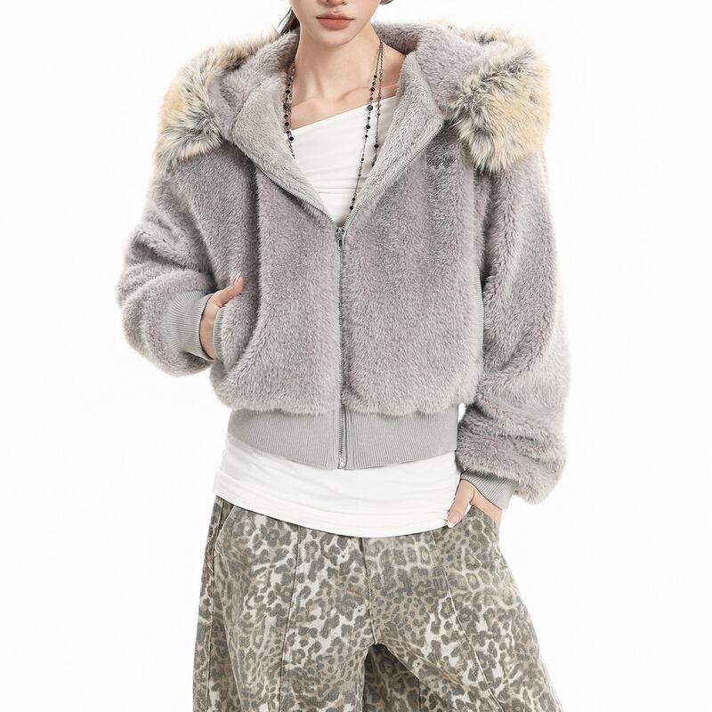 ふわふわのフードが特徴的なショート丈のジップアップジャケット。カジュアルながらも存在感のあるデザインで、普段のコーディネートにプラスするだけで、こなれ感を演出できます。ショート丈なので、スタイルアップ効果も期待でき、様々なボトムスとの相性も抜群です。