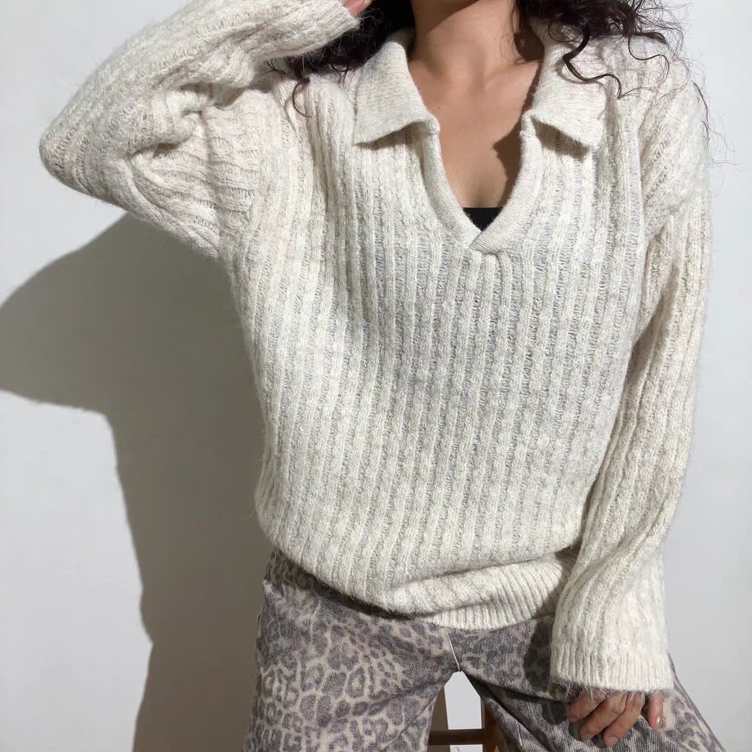 襟付きのVネックデザインが特徴の長袖ニットトップス。