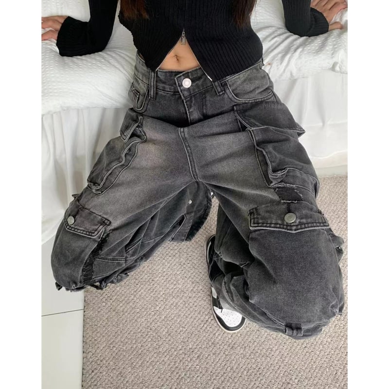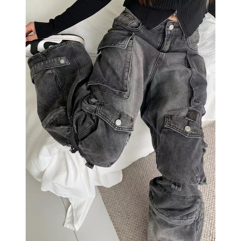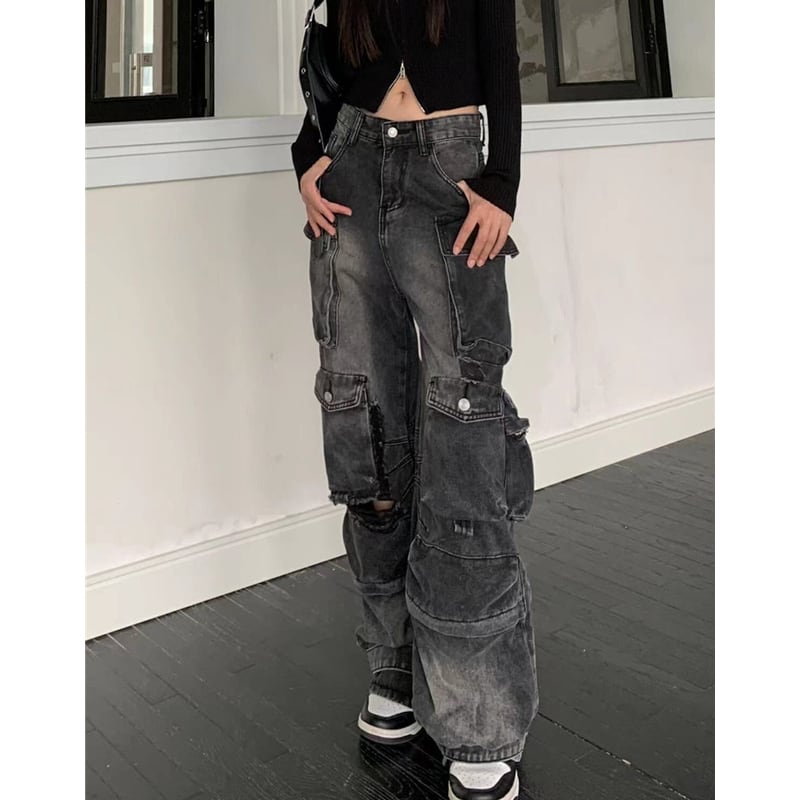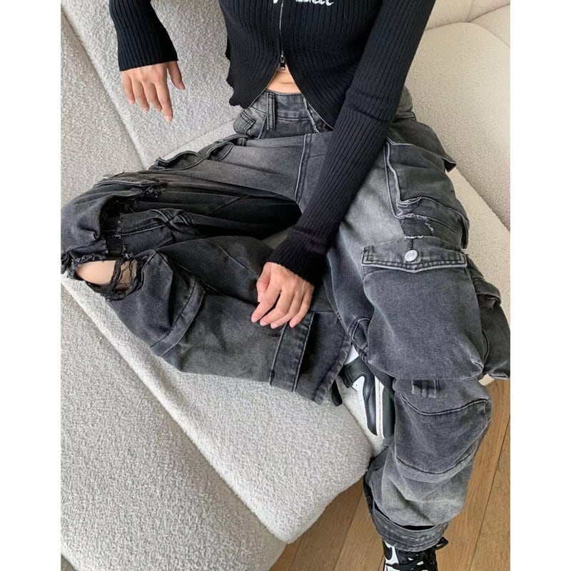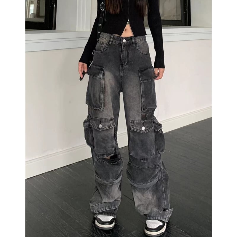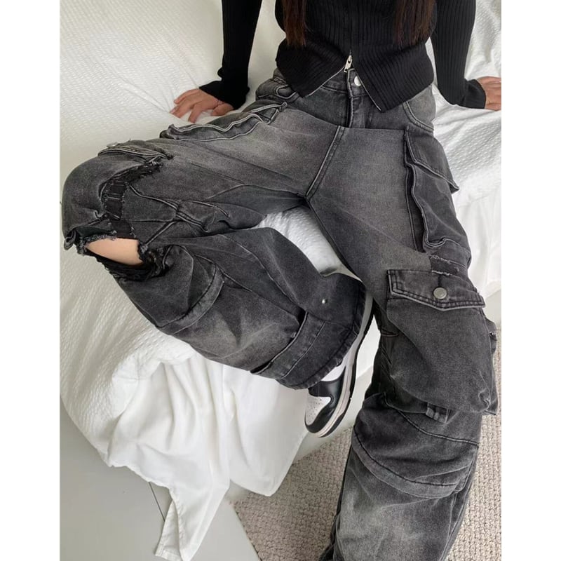 ダメージ加工が施された、存在感のあるカーゴワイドデニムパンツ。