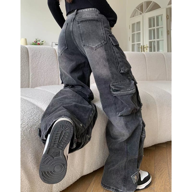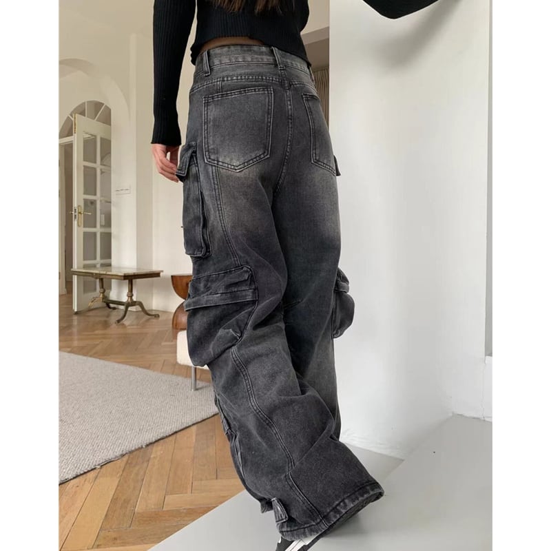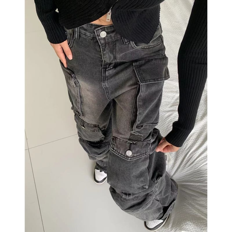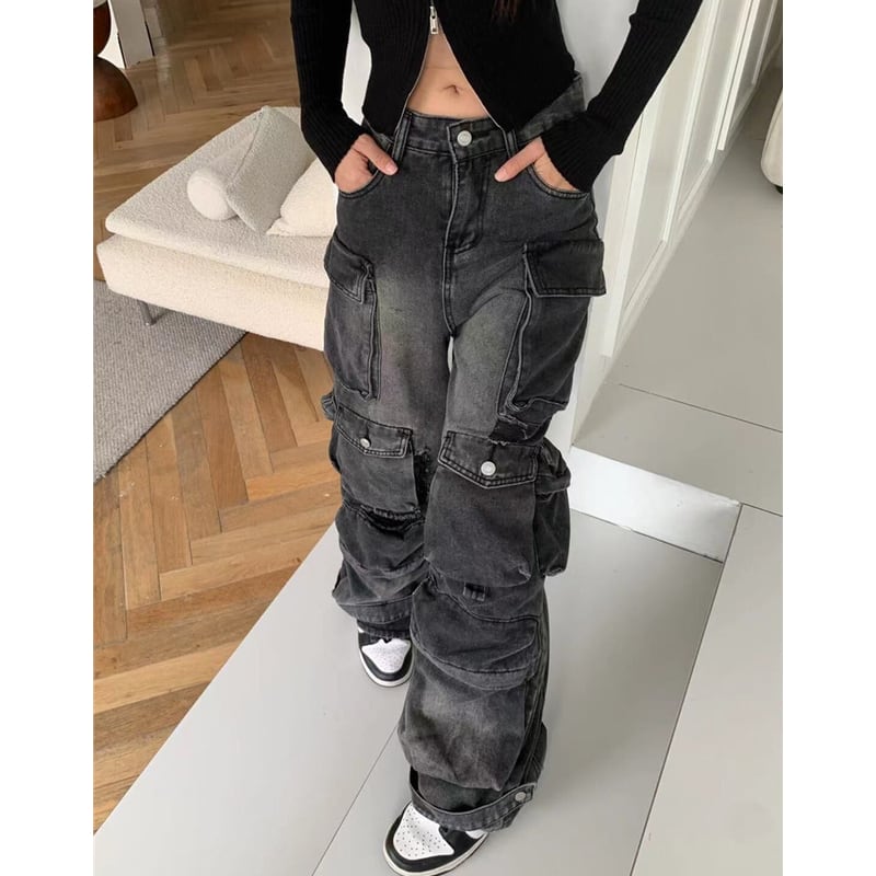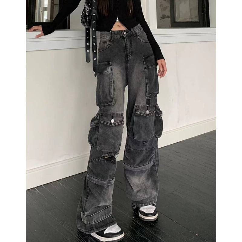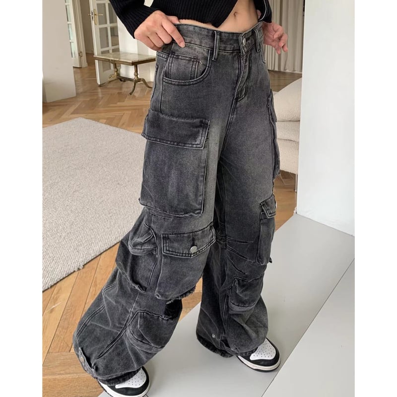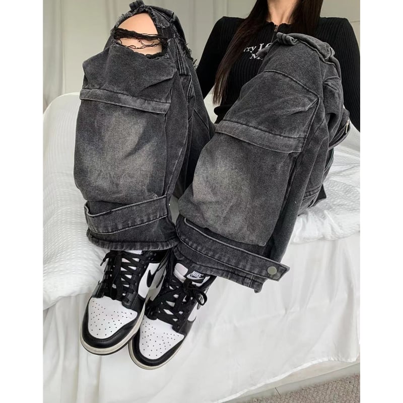 ダメージ加工が施された、存在感のあるカーゴワイドデニムパンツ。