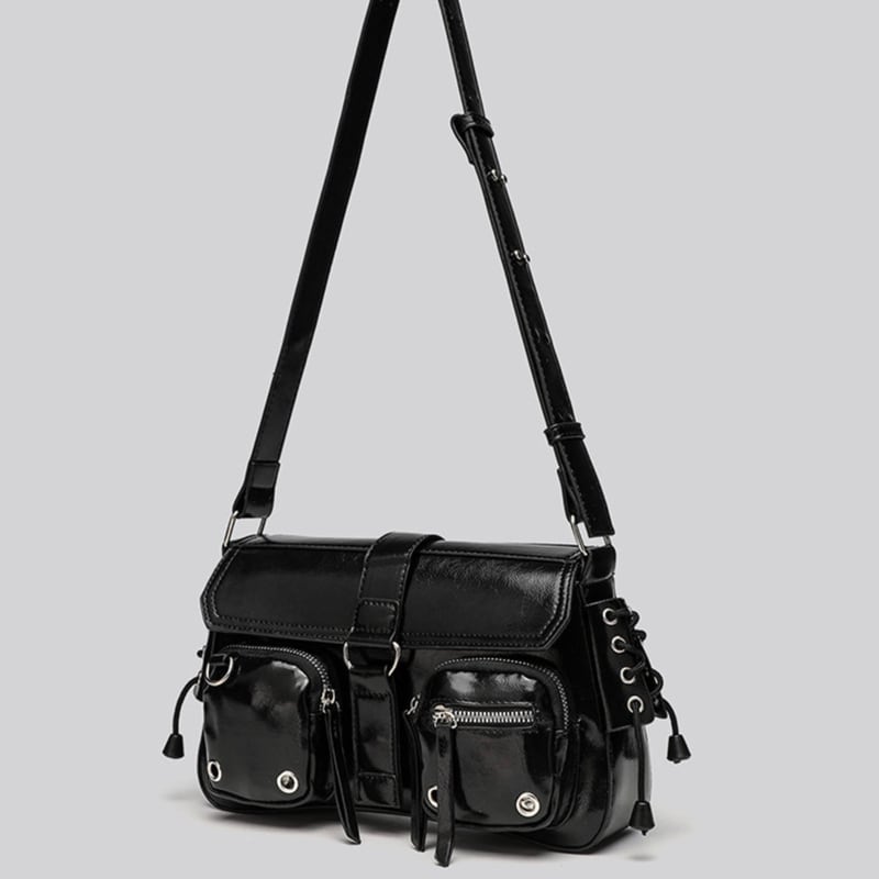 フラップとベルトバックルが特徴的なショルダーバッグです。前面に配置された複数のポケットは、デザインのアクセントとしてだけでなく、小物を整理して収納するのにも便利です。普段使いはもちろん、旅行やイベントなど、様々なシーンで活躍します。