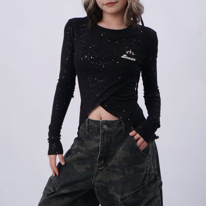 ラップスタイルのクロップド丈長袖Tシャツ。