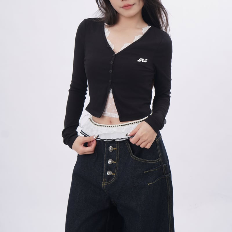 button front cropped long sleeve top la2757