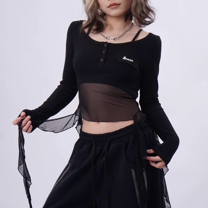 button front long sleeve sheer switch cropped top la2788