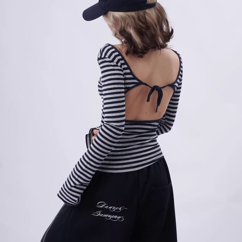 定番のストライプ柄を、バックオープンスタイルでアップデート。シンプルなデザインながらも、背中のリボンがアクセントになり、こなれ感を演出します。デニムやスカートなど、どんなボトムスとも相性抜群。大人のカジュアルスタイルを楽しみたい方におすすめです。