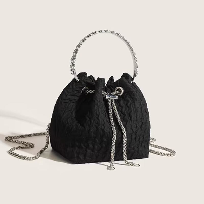 アクセサリー感覚で持てる、ミニハンドバッグです。リングハンドルが目を惹き、コーディネートのアクセントになります。チェーンストラップ付きで、ショルダーバッグとしても使用可能です。