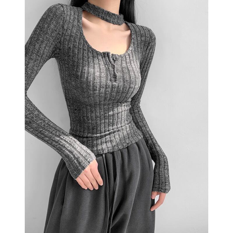 choker neck long sleeve slim rib top la2827
