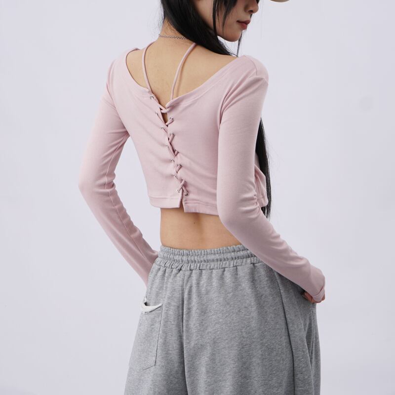 トレンドのクロップド丈と、バックスタイルのレースアップがポイントの長袖Tシャツ。シンプルなフロントデザインなので、どんなボトムスにも合わせやすいのが魅力です。背中の開き具合はレースアップで自由に調整可能。自分らしい着こなしを楽しめます。