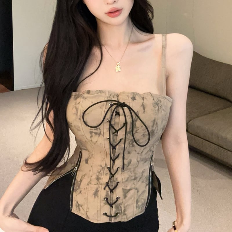 レースアップデザインが目を引くノースリーブのチューブトップ。肩紐付きで安心感があり、トレンド感のあるスタイリングが楽しめます。カジュアルな普段使いはもちろん、ちょっとしたお出かけにもおすすめです。