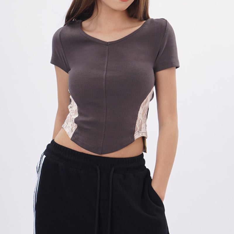 シンプルなデザインながらも、レースが目を引くクロップドTシャツ。