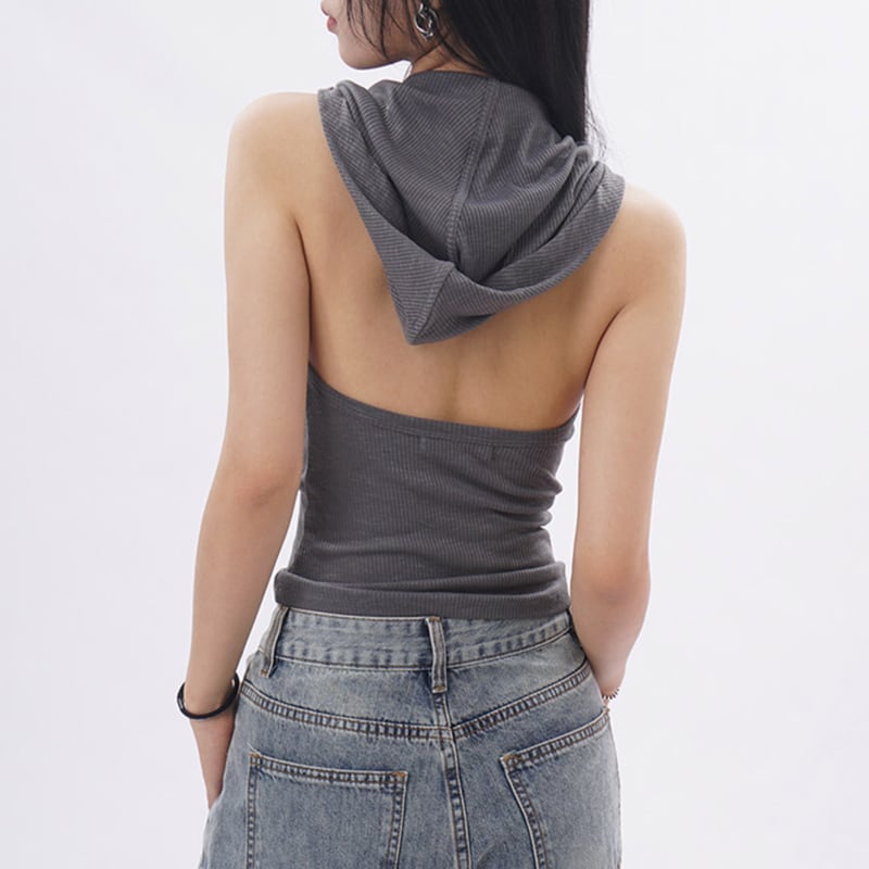 大胆なバックスタイルが魅力のフード付きノースリーブトップス。ヘルシーな肌見せで、普段の着こなしにアクセントをプラスします。リブ素材ならではの快適な着心地で、アクティブなシーンでもストレスフリーに過ごせます。