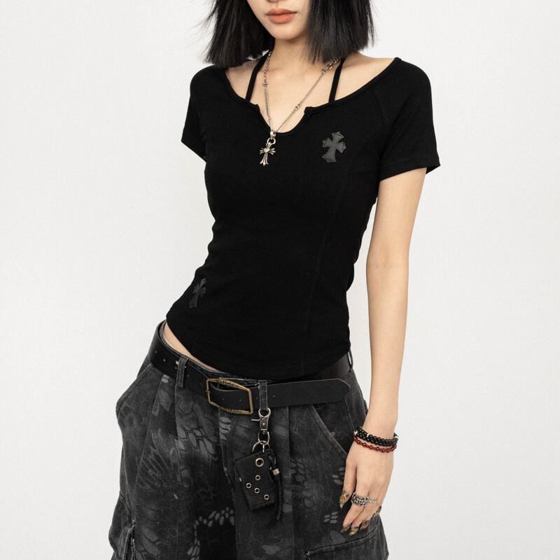 シンプルでありながら、デザイン性の高い半袖Tシャツ。特徴的なVネックと、ワンポイントとなるクロスモチーフが、アクセントとして効いています。タイトなフィット感で、どんなボトムスともバランス良く着こなせる、着回しの良い一枚です。