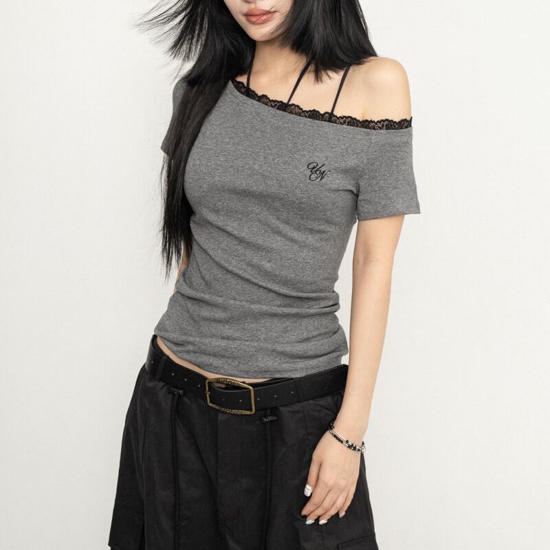 off-shoulder lace design short-sleeve fit cut and sewn la2883