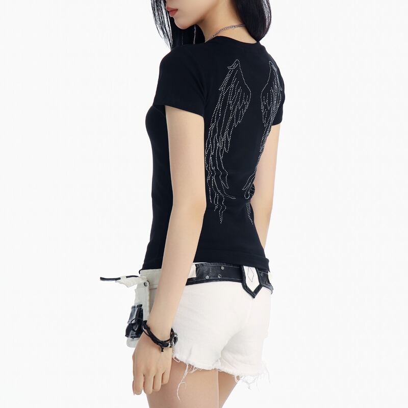 エッジの効いたスタイルを完成させる、バックプリントが特徴のカットソーです。背中を飾る繊細かつ大胆なラインストーンのウィングモチーフは、視線を集めること間違いなし。いつものコーディネートにプラスするだけで、周りと差をつける個性的なスタイリングが実現します。