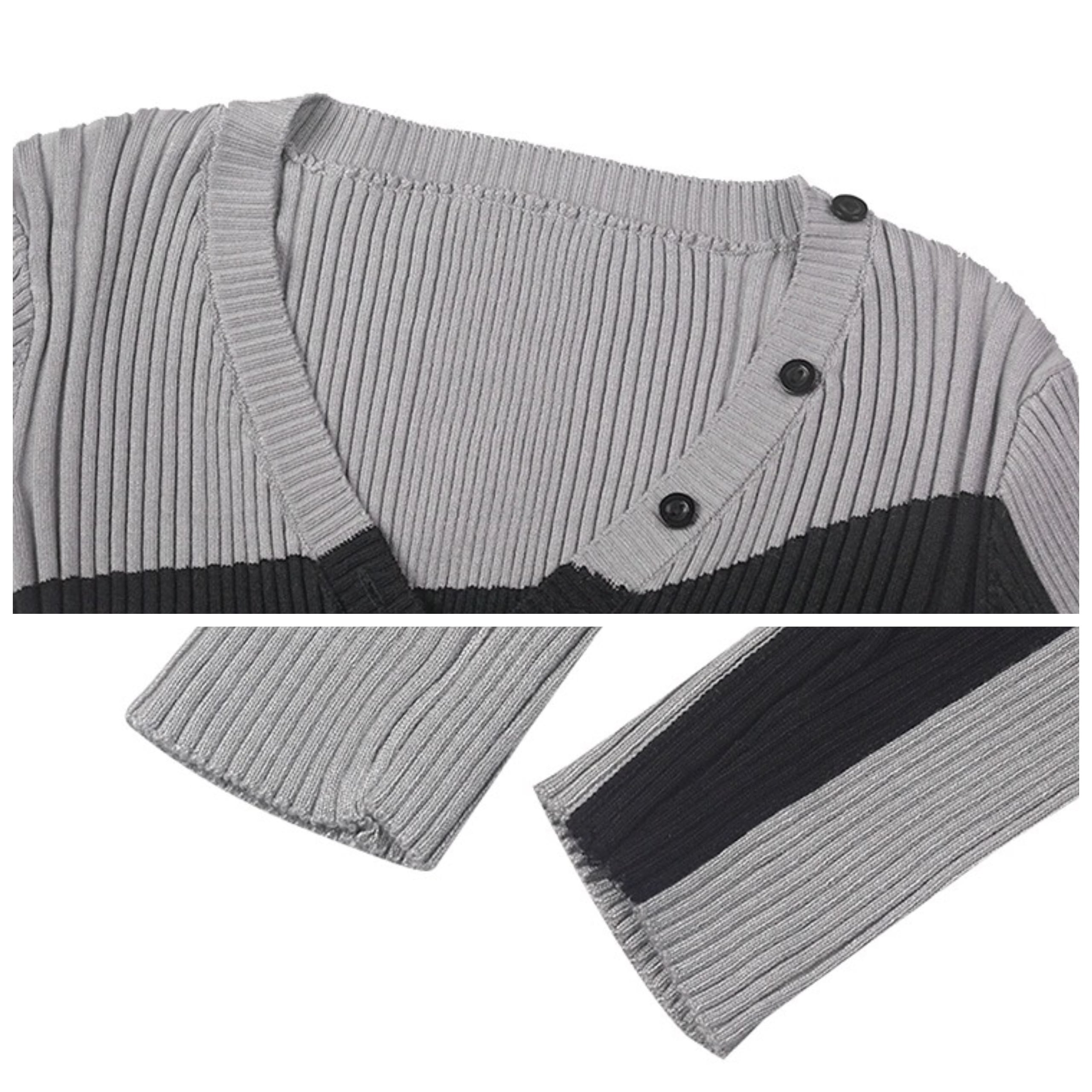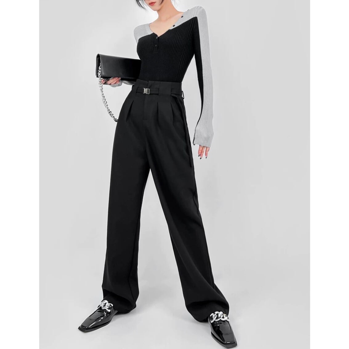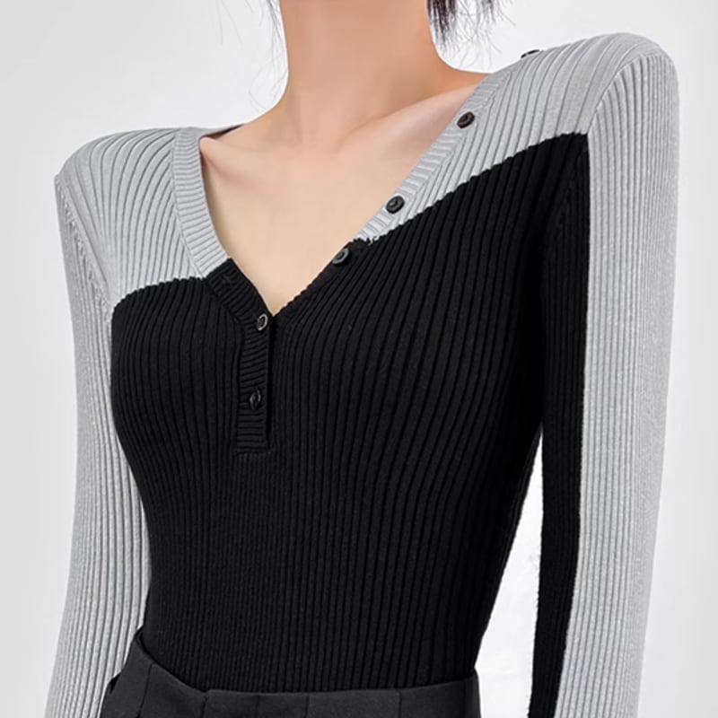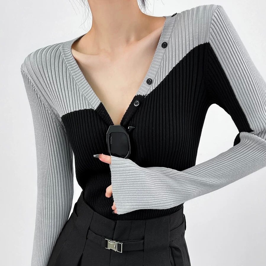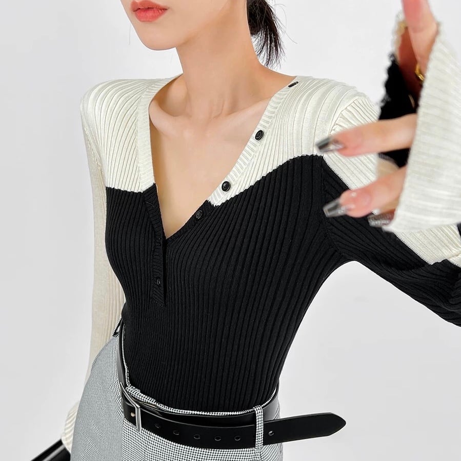 ベルスリーブとツートンで大人の魅力漂うニットトップス。深Vネックとタイトなシルエットで華奢見えを叶えます。ボリュームのあるボトムと合わせるのがおすすめです。
