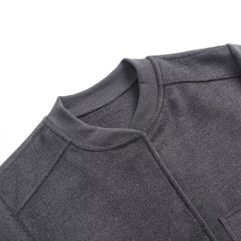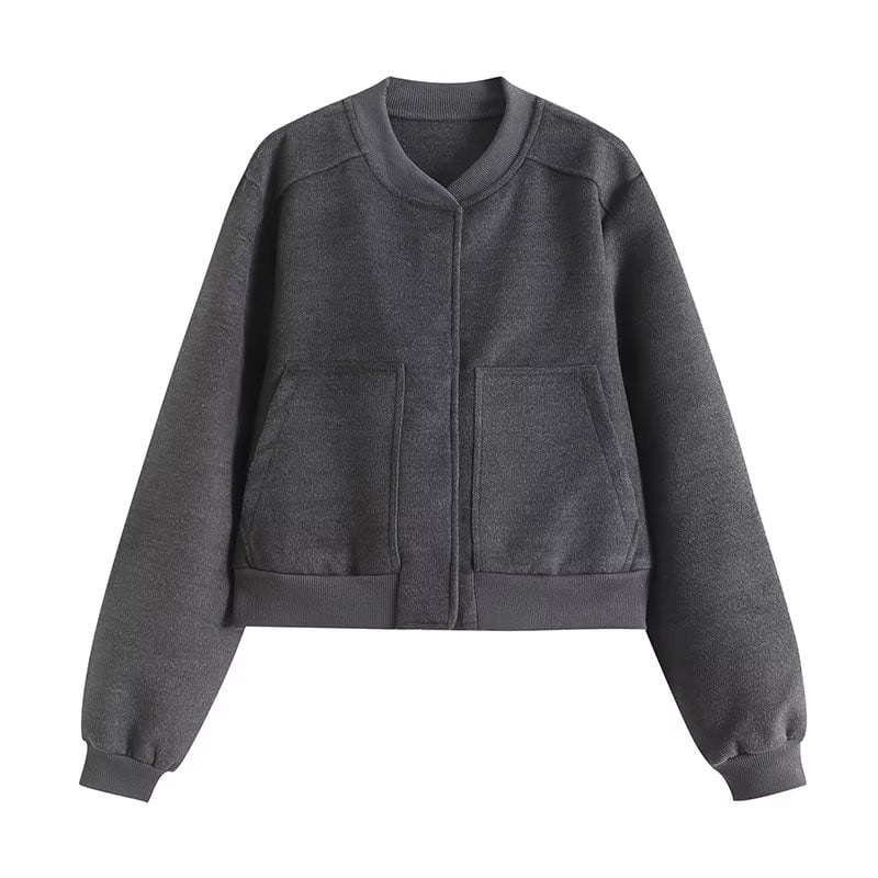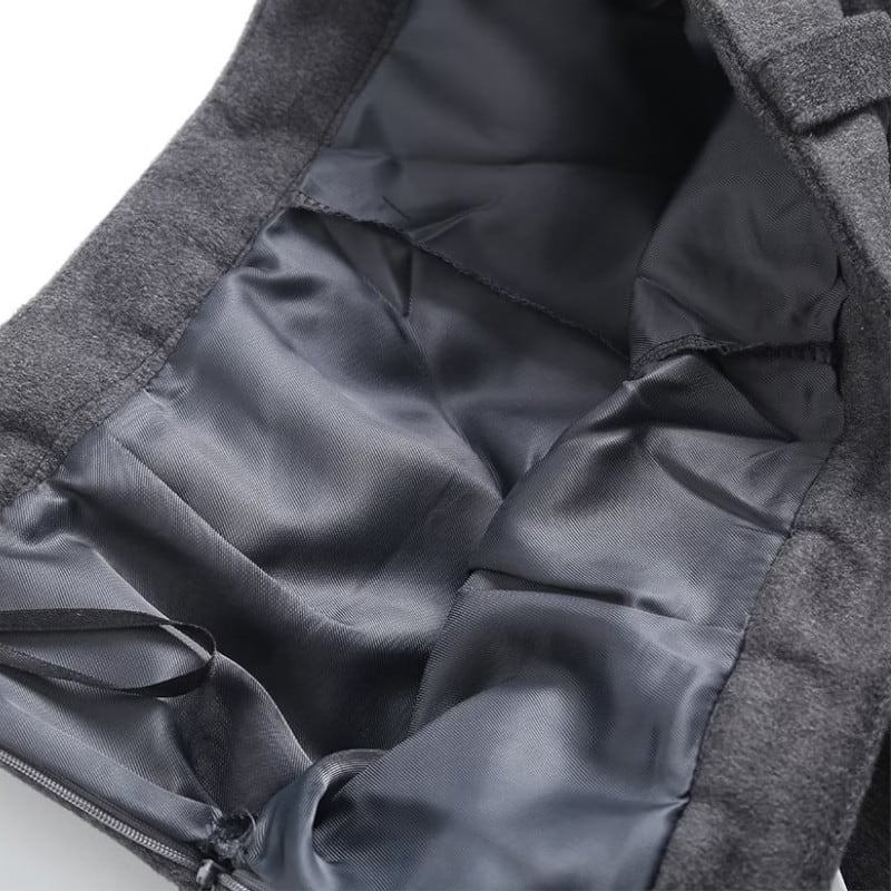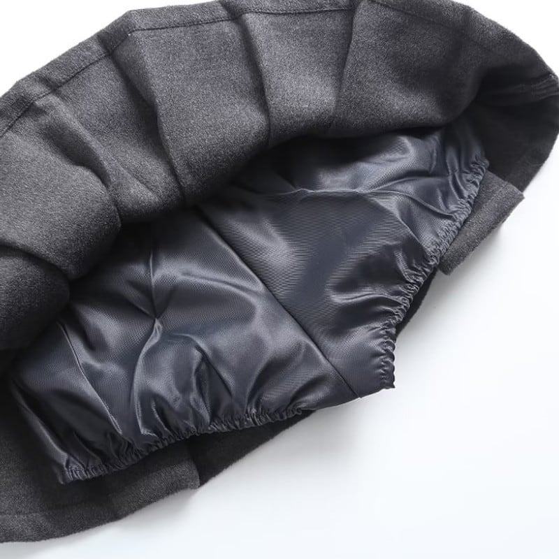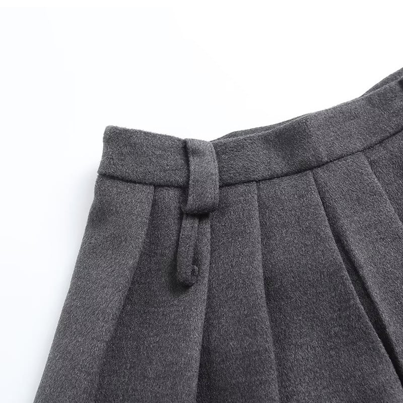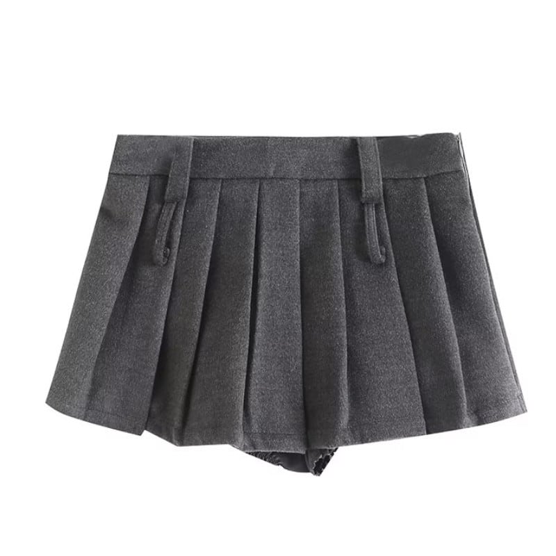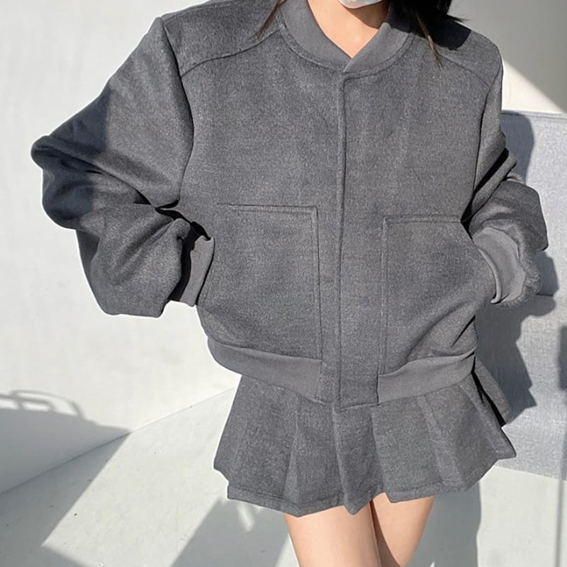グレーのカラーが洗練された印象を与える、ショートジャケットとプリーツミニキュロットスカートのセットアップ。