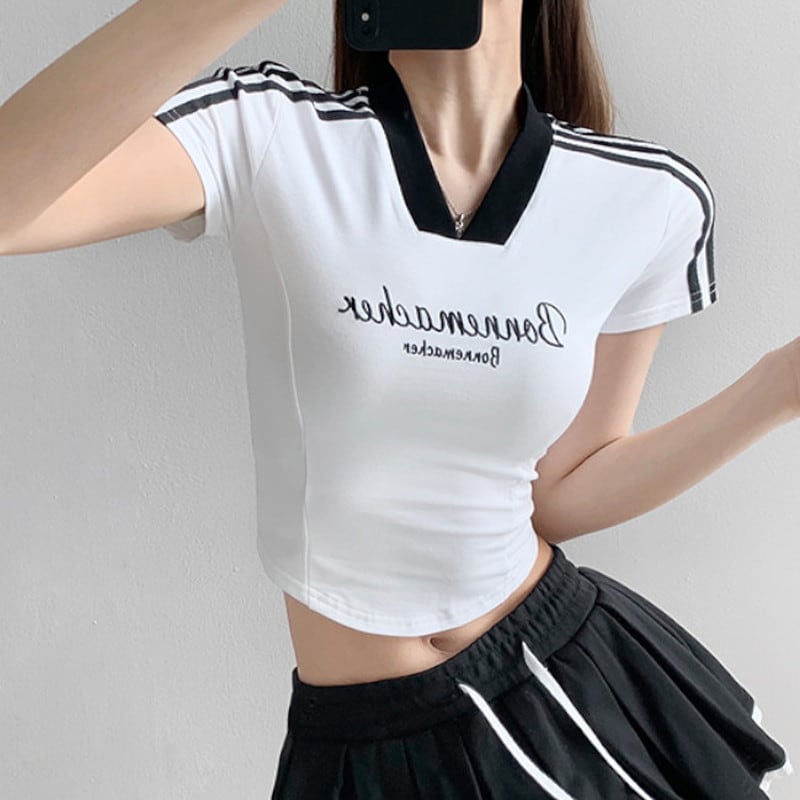 letter print V-neck bicolor T-shirt la0900