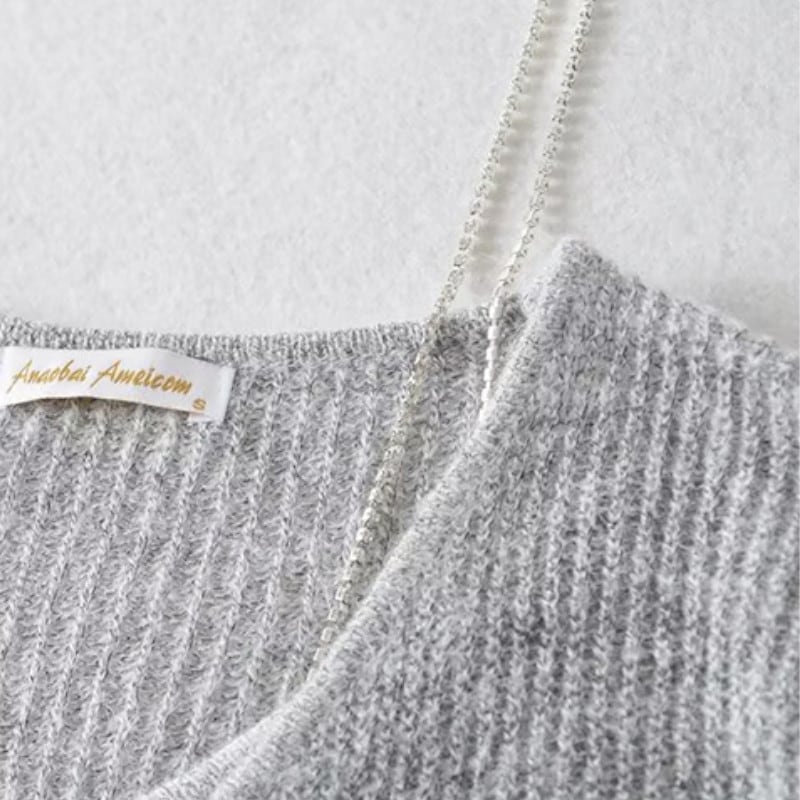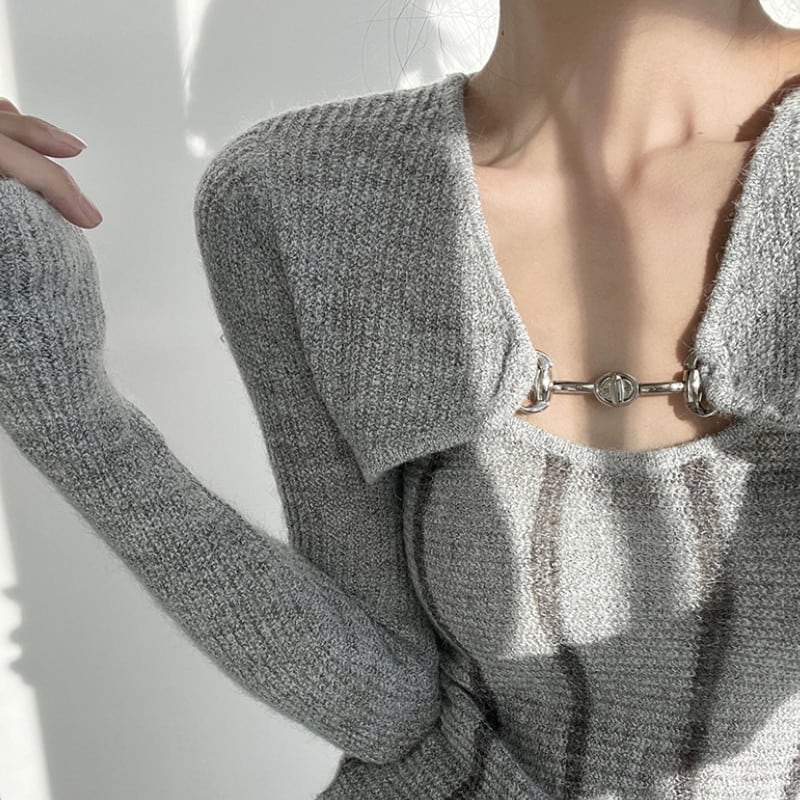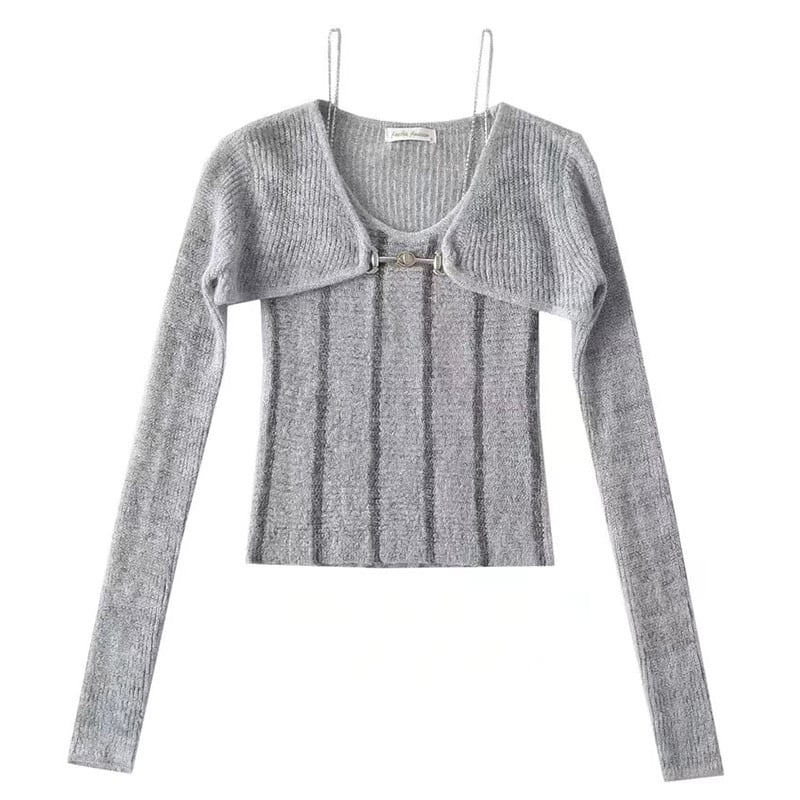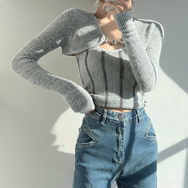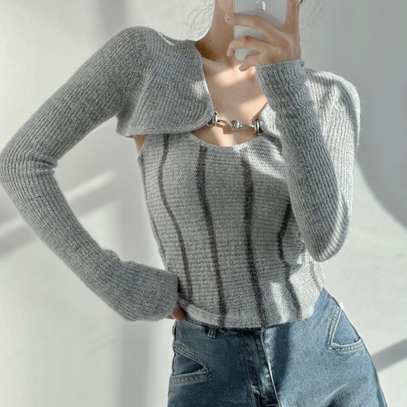 メタルの装飾が施されたボレロとストライプ柄のキャミソールの2点セット。
