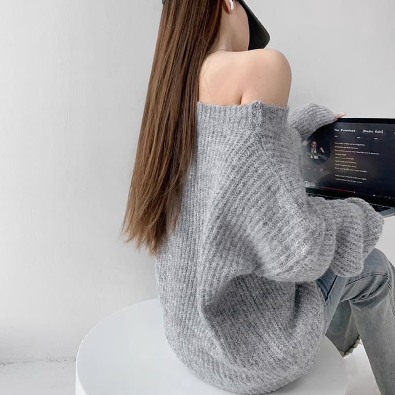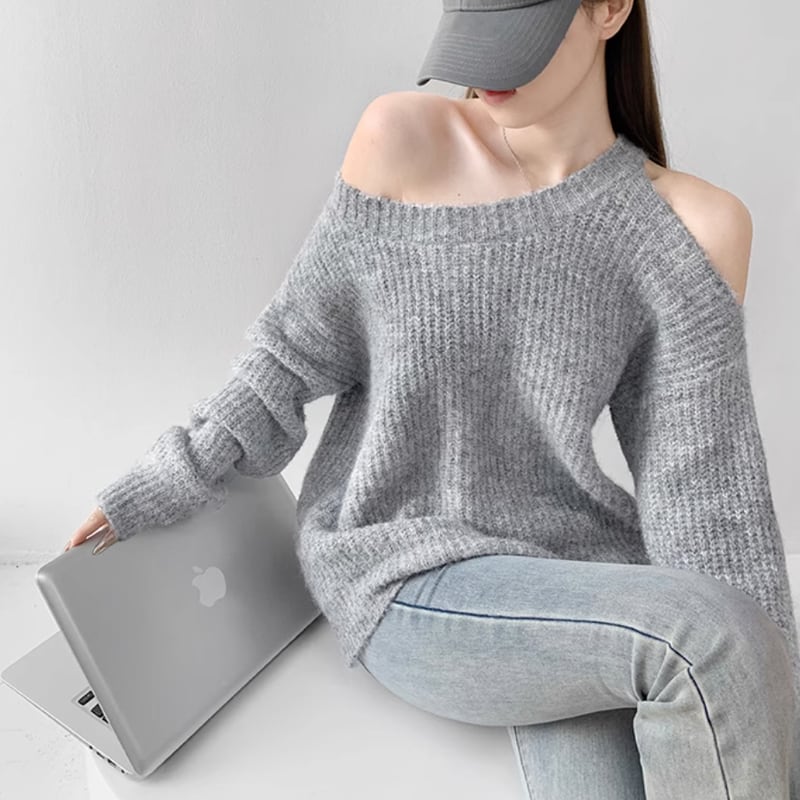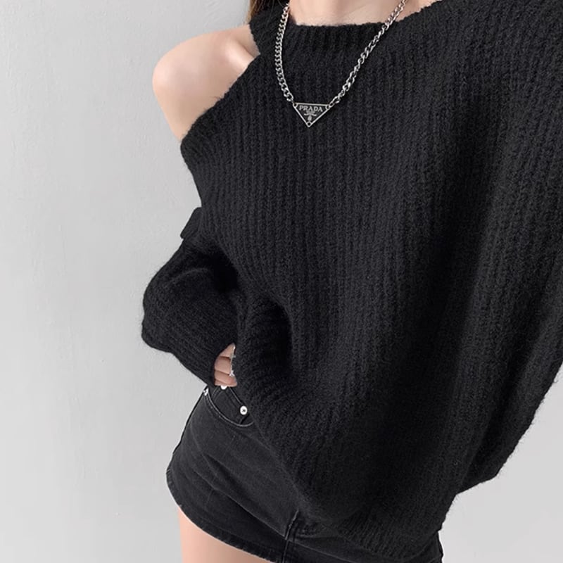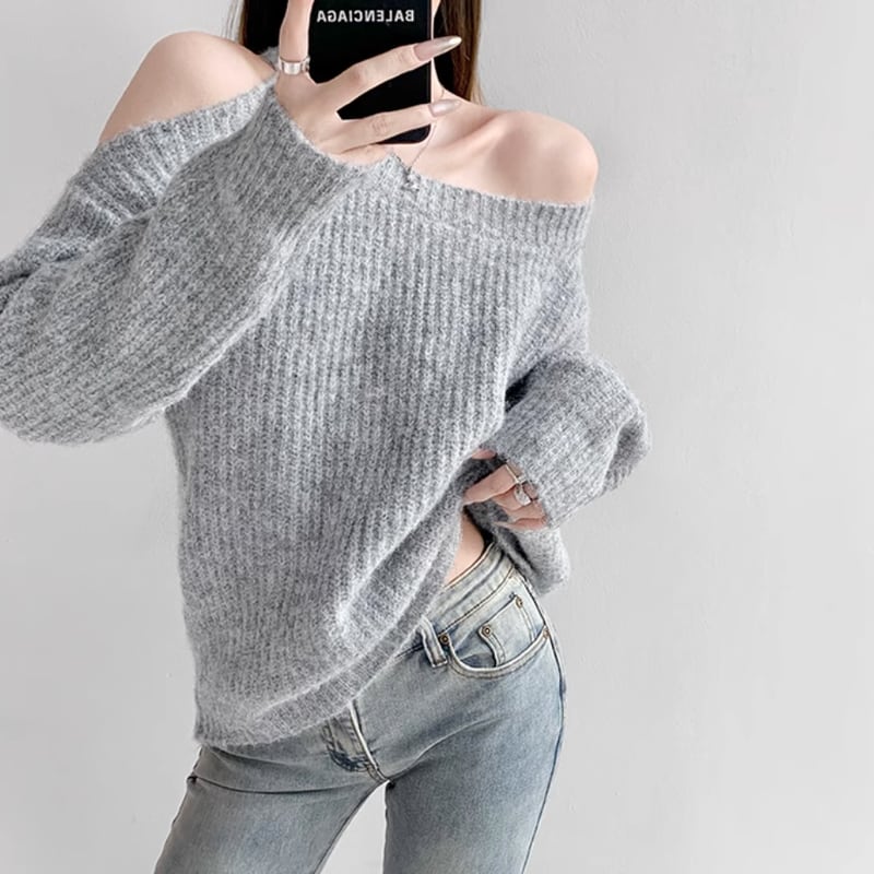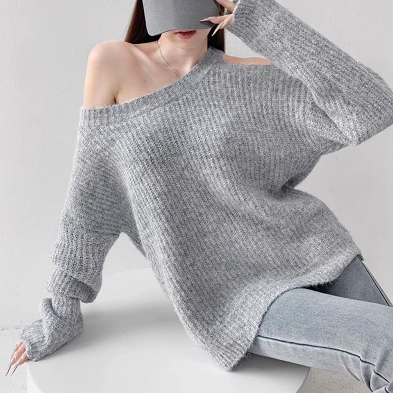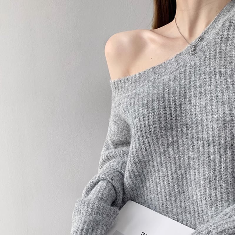 オフショルダーデザインとアシンメトリーなシルエットが魅力的なニットセーターです。
