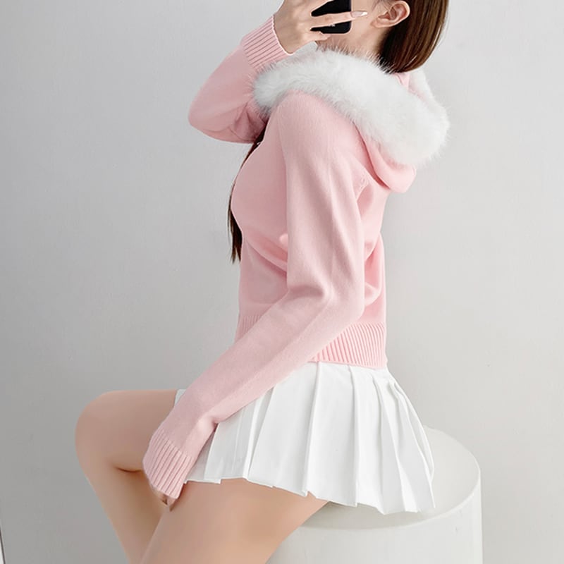 淡いピンクの色合いとふわふわの白のファーが、女性らしい柔らかな印象を与えます。