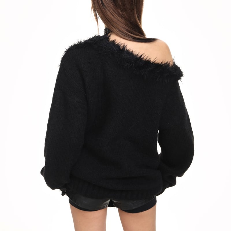 オフショルダーのデザインが女性らしさを引き立てるニットセーター。