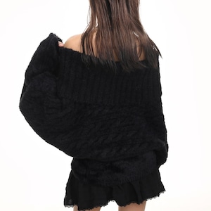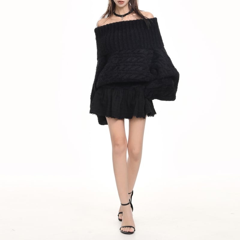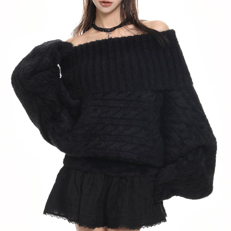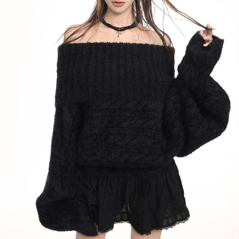 オフショルダーデザインとバルーンスリーブが魅力的なニットトップス。