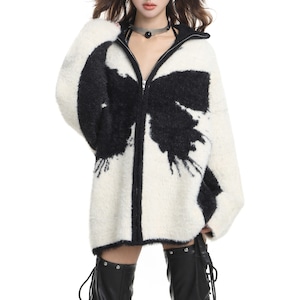 オーバーサイズのシルエットと大胆な蝶柄が目を惹くニットカーディガン。