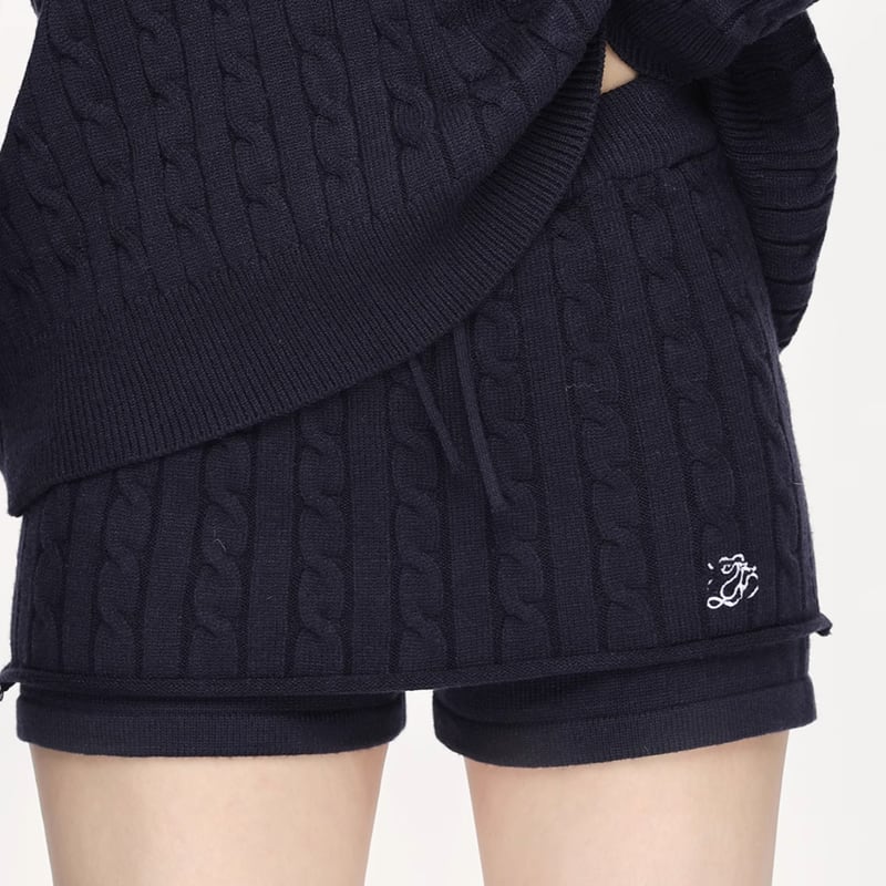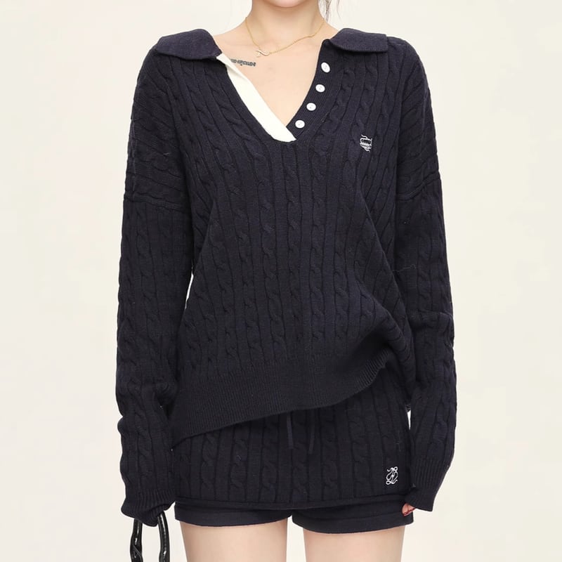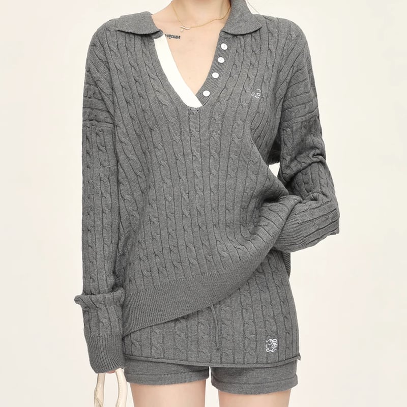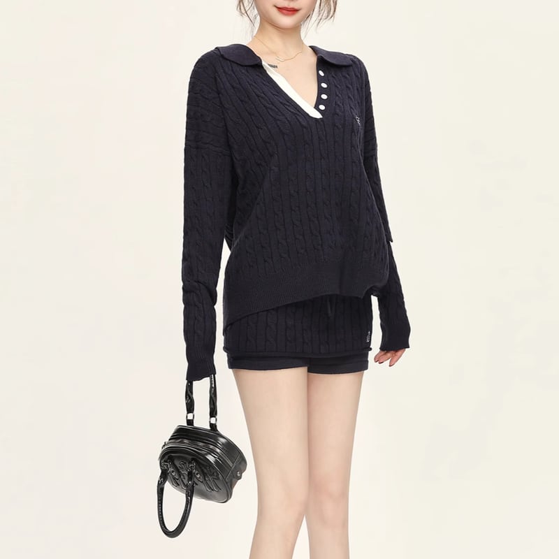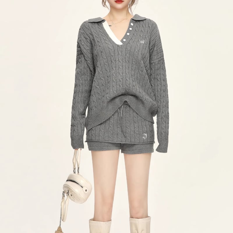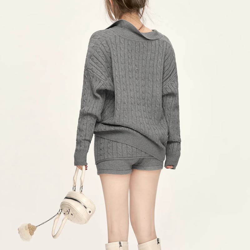 上品なケーブルニットのVネックセーターとショートパンツのセットアップです。